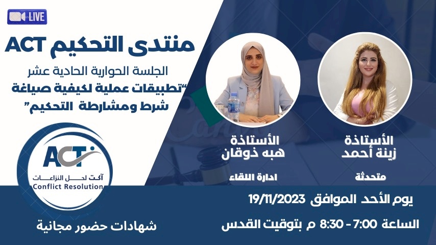 تتشرف مؤسسة آكت لحل النزاعات بدعوتكم لحضور الجلسة الحوارية الحادية عشر من منتدى التحكيم ACT تحت عنوان: "تطبيقات عملية لكيفية صياغة شرط ومشارطة التحكيم "