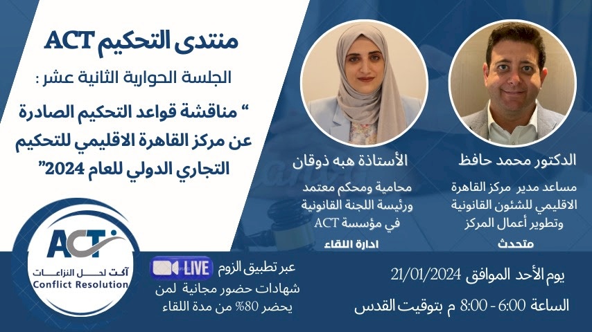 تتشرف مؤسسة ACT لحل النزاعات بدعوتكم لحضور الجلسة الحوارية الثانية عشر من منتدى التحكيم تحت عنوان: " مناقشة قواعد التحكيم الصادرة عن مركز القاهرة الإقليمي للتحكيم التجاري الدولي للعام 2024 ".