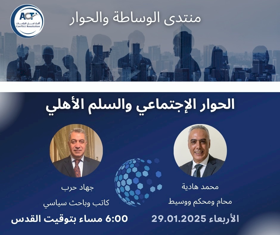 تتشرف مؤسسة ACT للدراسات وحل النزاعات بدعوتكم لحضور ندوة حول موضوع “الحوار الاجتماعي والسلم الأهلي في فلسطين” من خلال منتدى الوساطة والحوار .